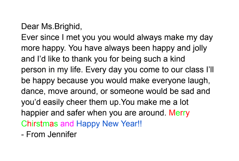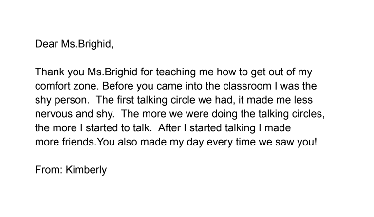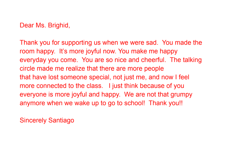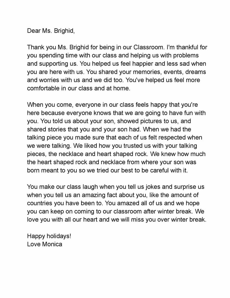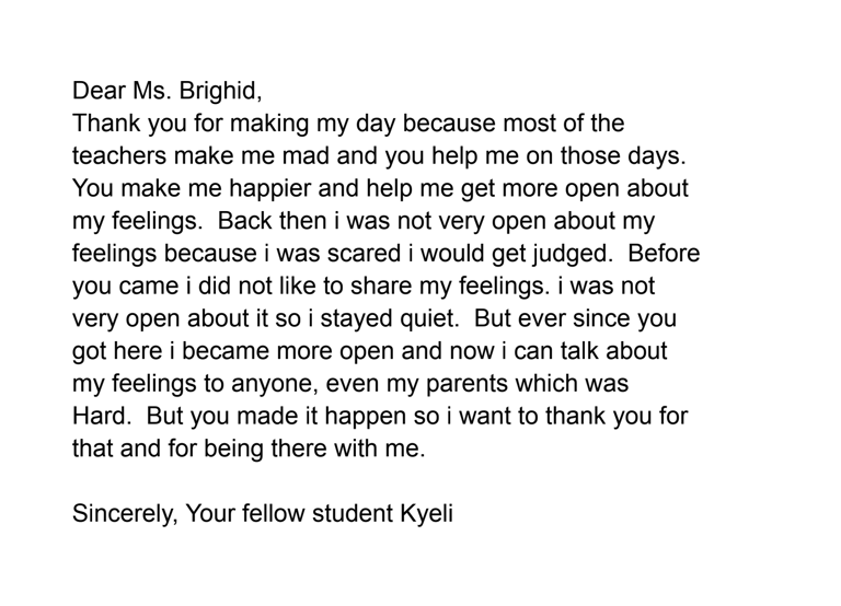 "Brighid has a sincere and genuine personality. She is very thoughtful and honest and approaches group time with enthusiasm and a fresh approach. She offered my students a weekly time to be mindful which is a topic we have discussed often this school year and she brought out softer sides of certain students that I had not seen all year!"